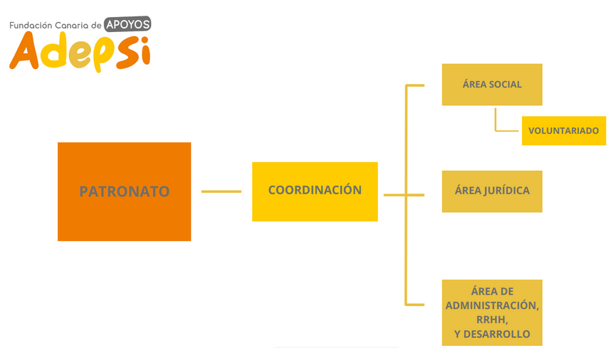Fundación Canaria de Apoyos ADEPSI se encuentra integrada por los siguientes órganos y áreas: Órganos de Gobierno y Representación, Órgano de Coordinación, Áreas de Ejecución y Área de Voluntariado.